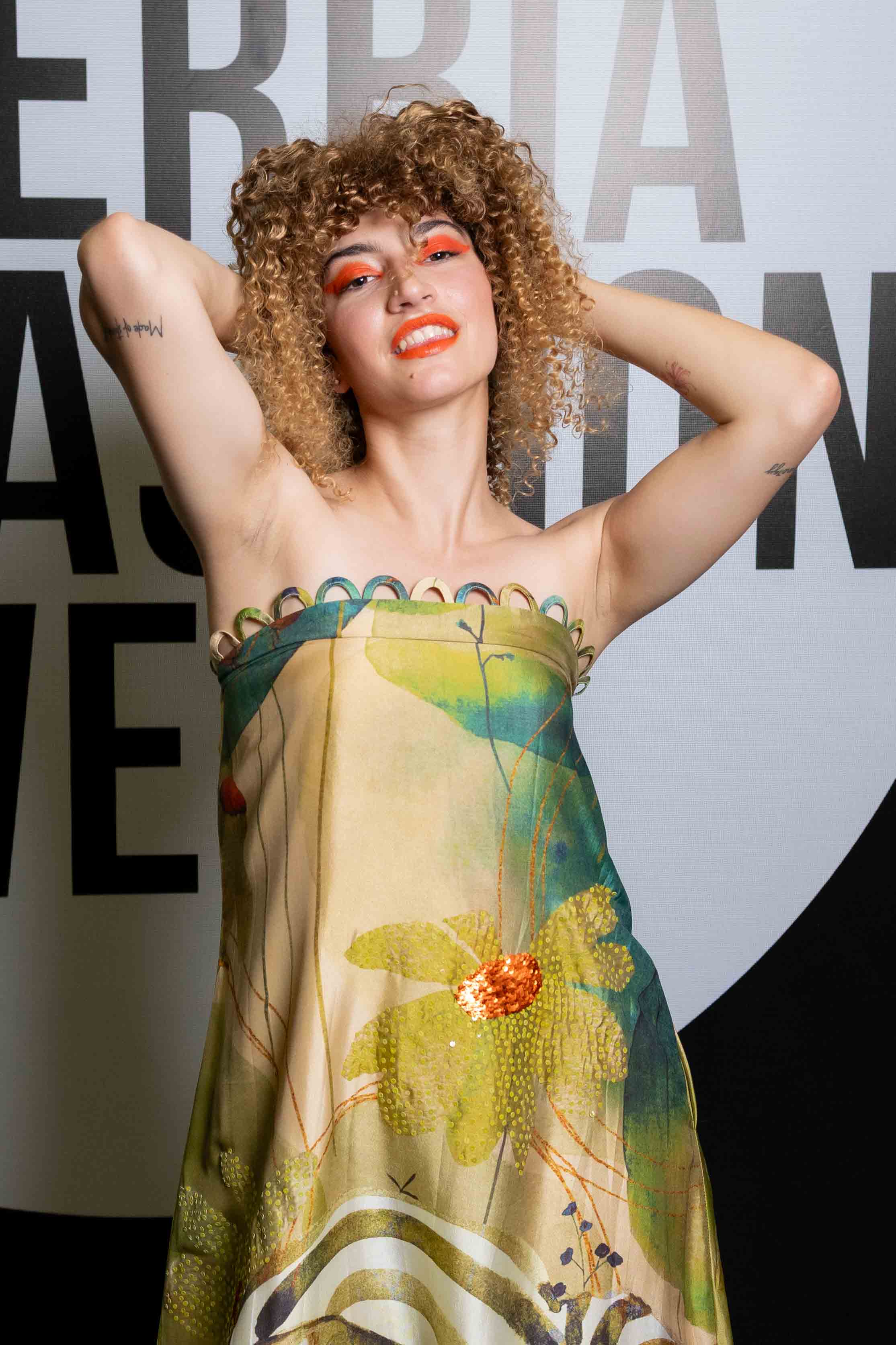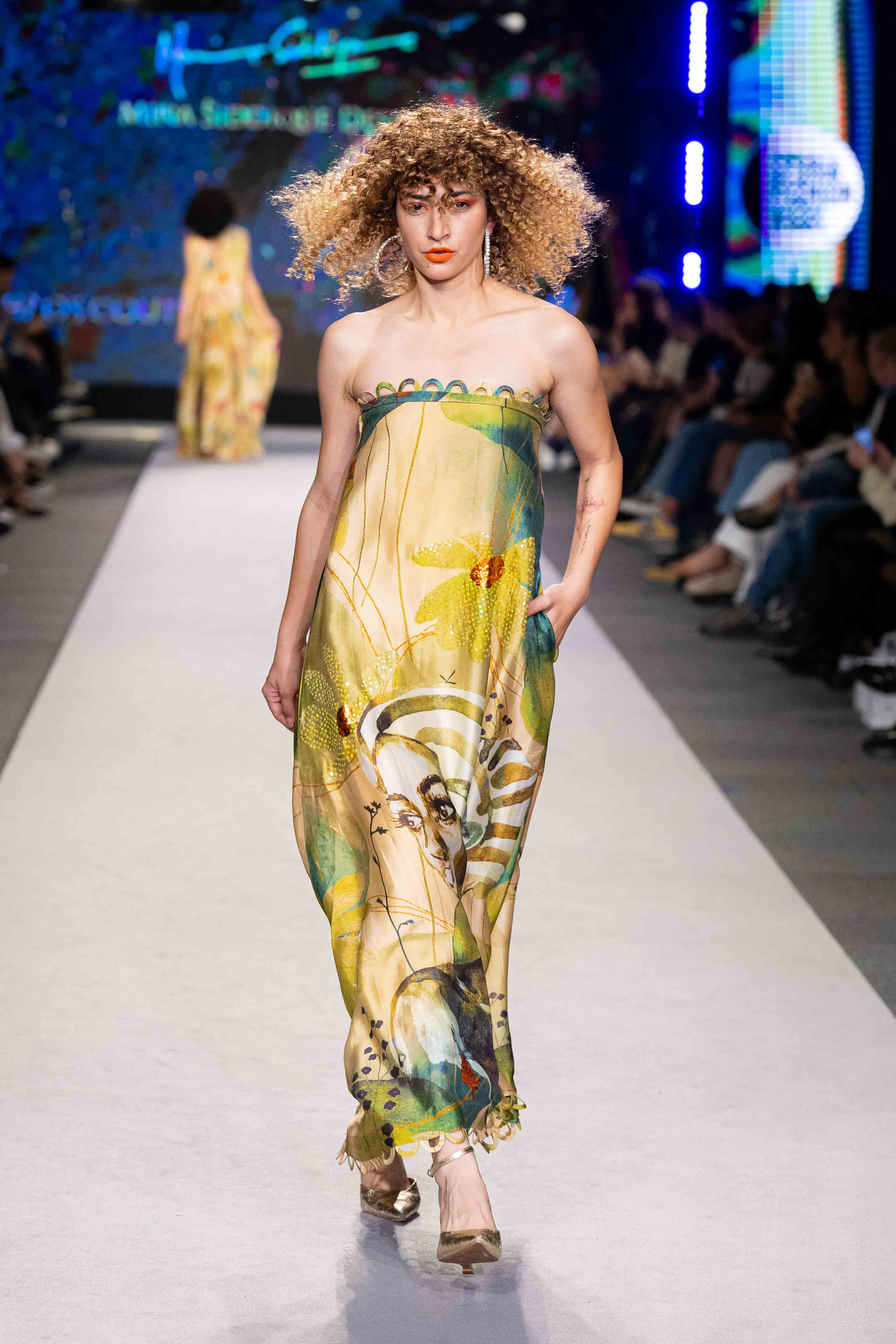 A flowing strapless gown in luminous gold and green, Aurora blooms with bold florals and a delicate portrait detail. Radiant and ethereal, it embodies renewal, strength, and light.