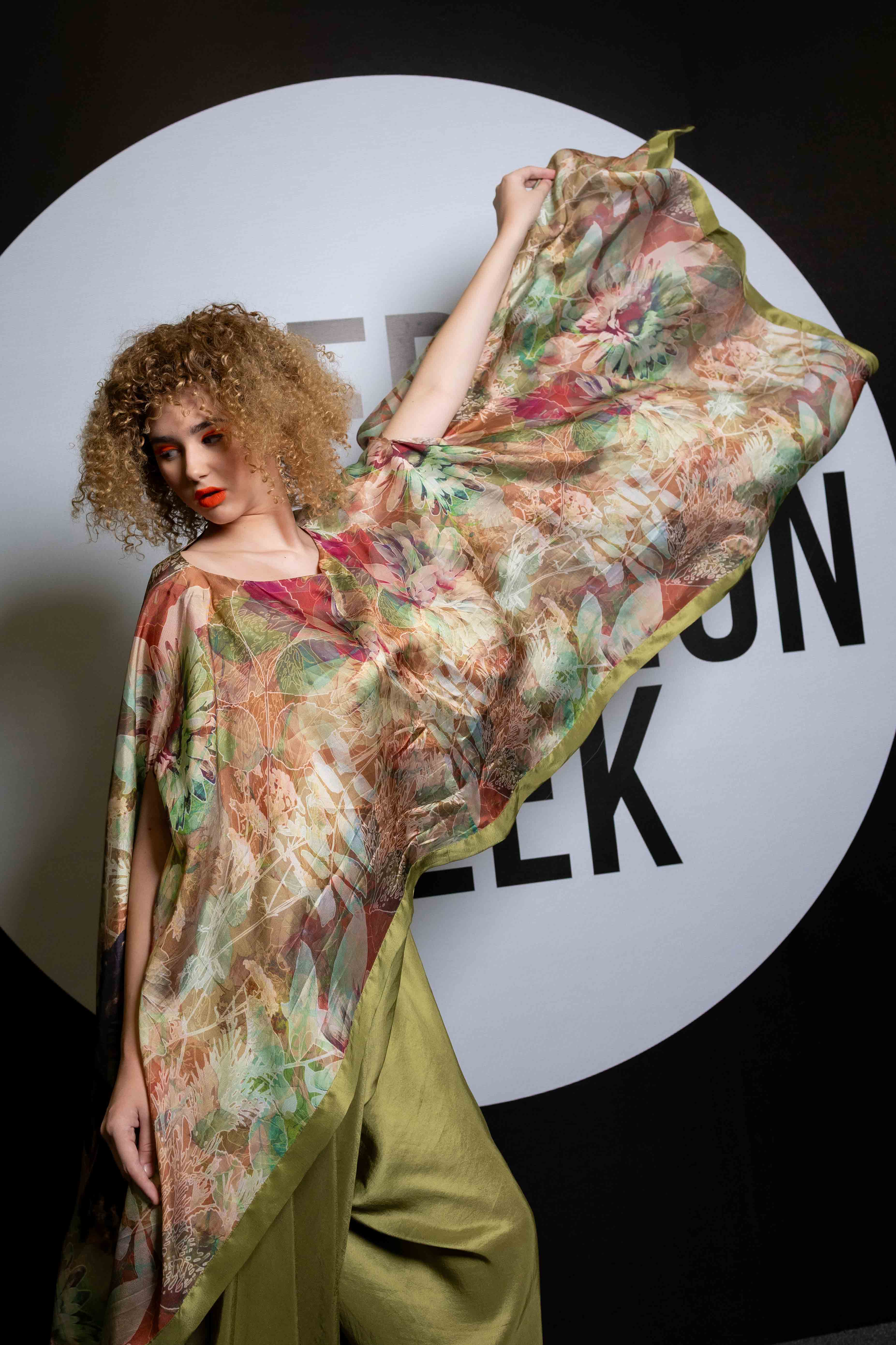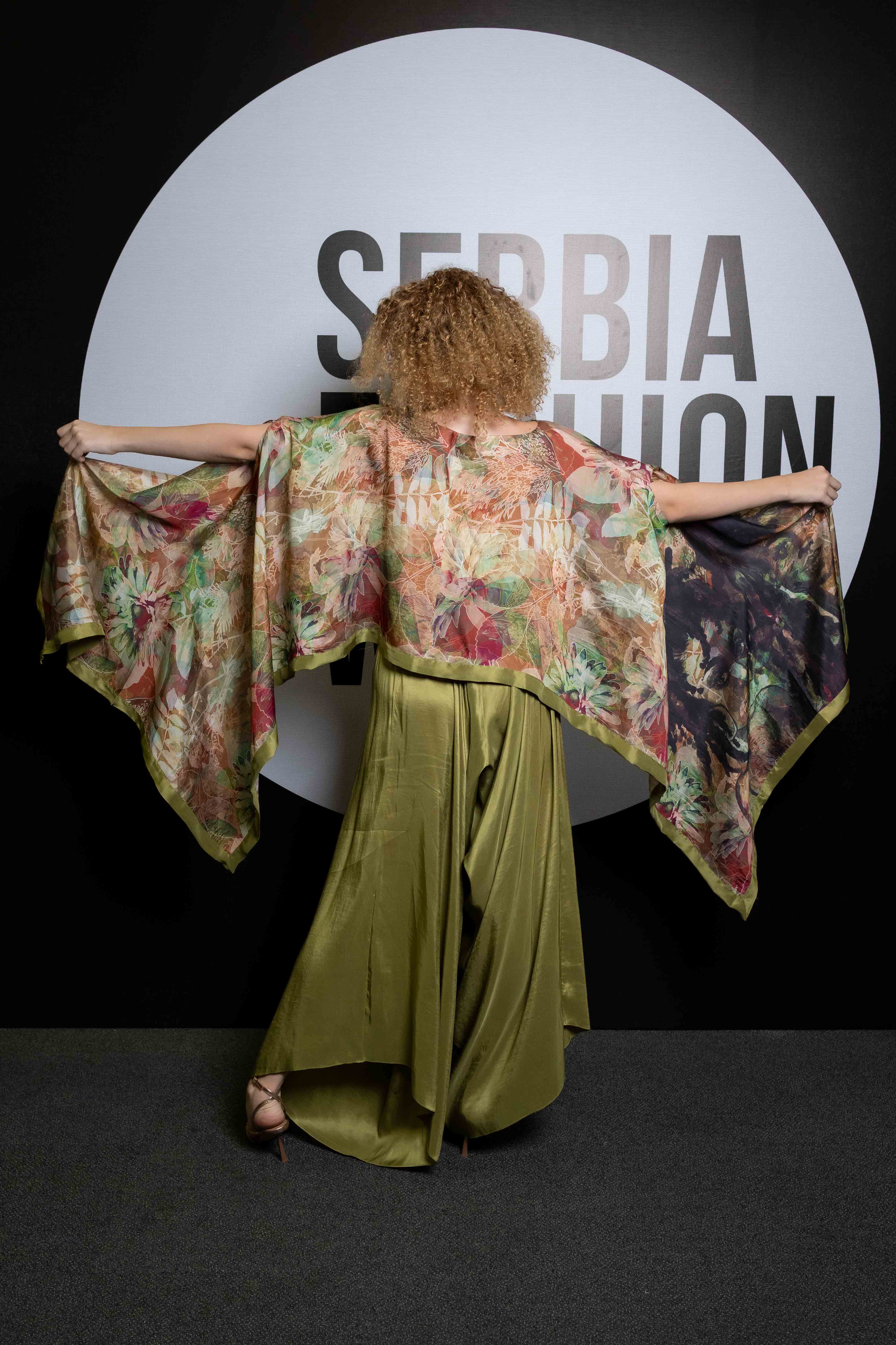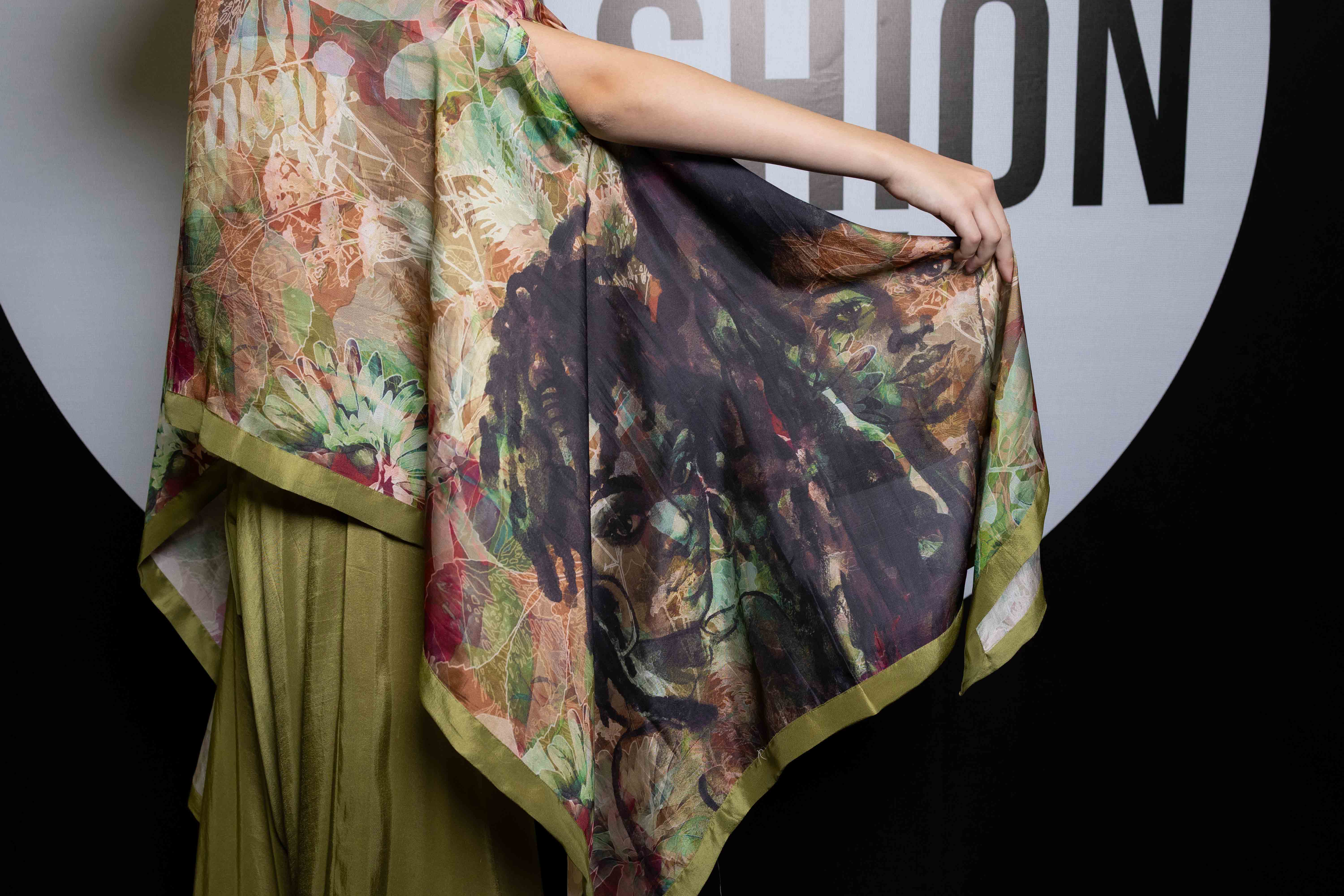 Verdant is a flowing ensemble inspired by nature’s quiet strength and organic beauty. The hand-illustrated cape top blooms with earthy tones and abstract foliage, draping effortlessly over fluid silk trousers in deep olive green. The silhouette is both structured and free, balancing refinement with ease—an ode to natural grace and the timeless power of simplicity.