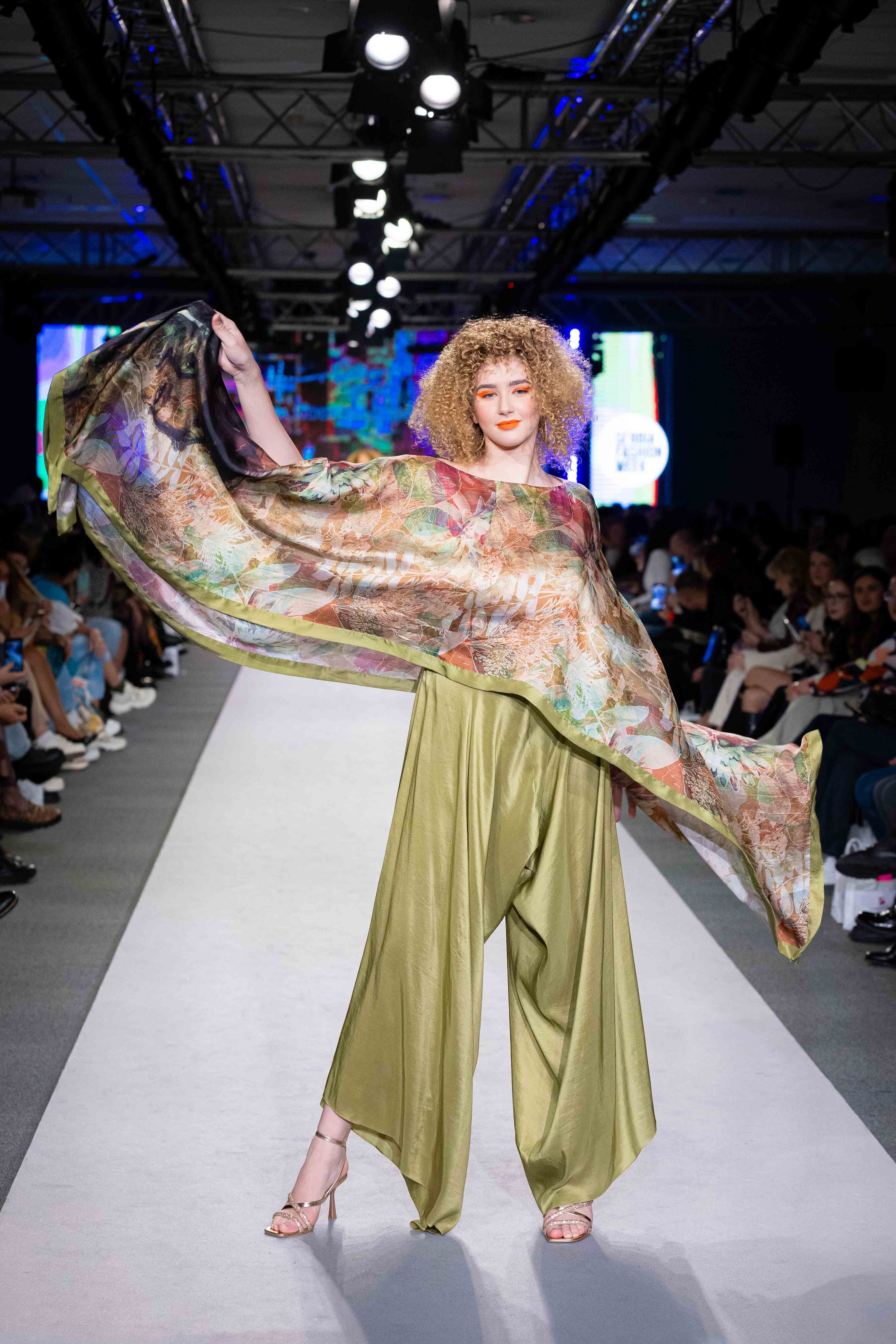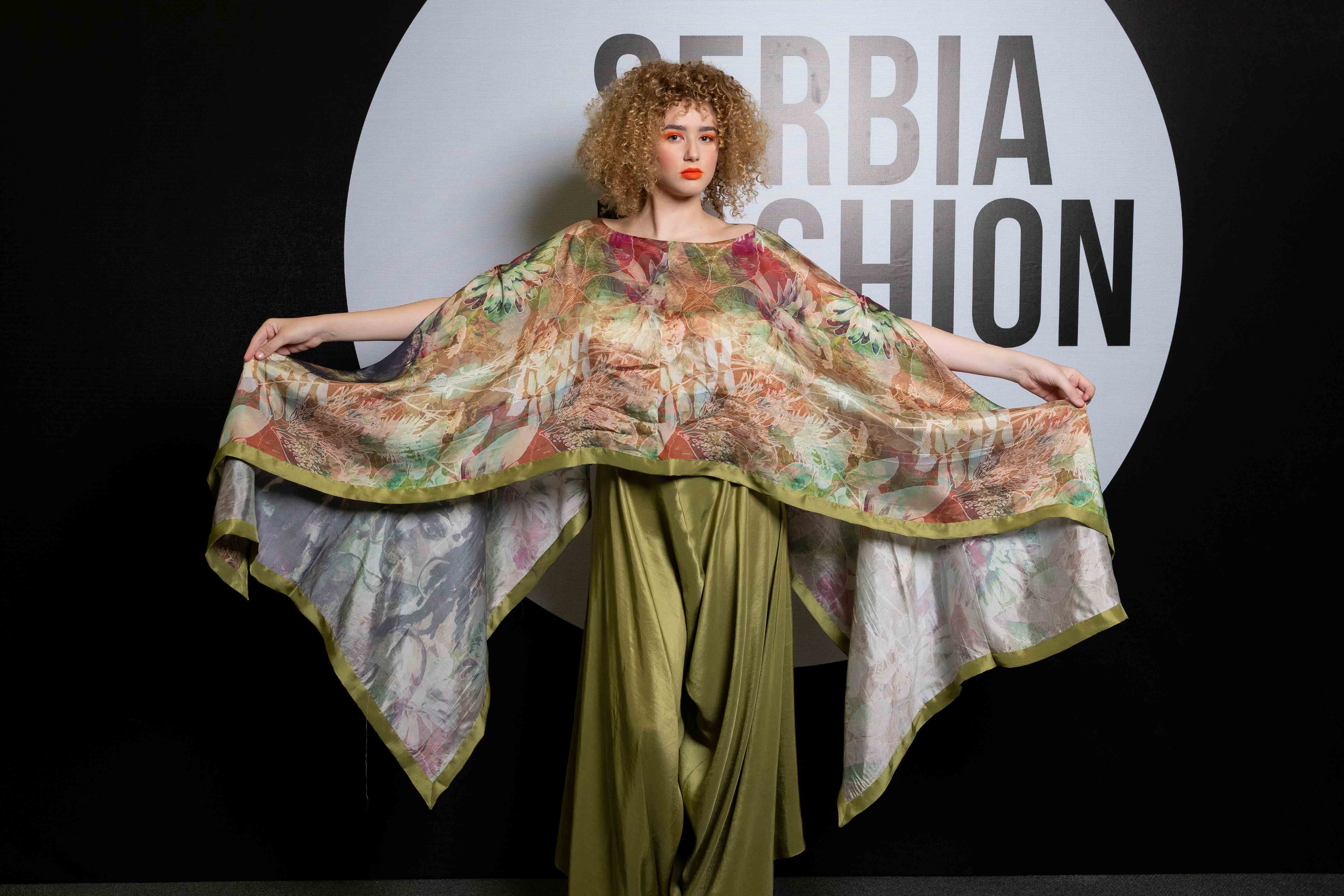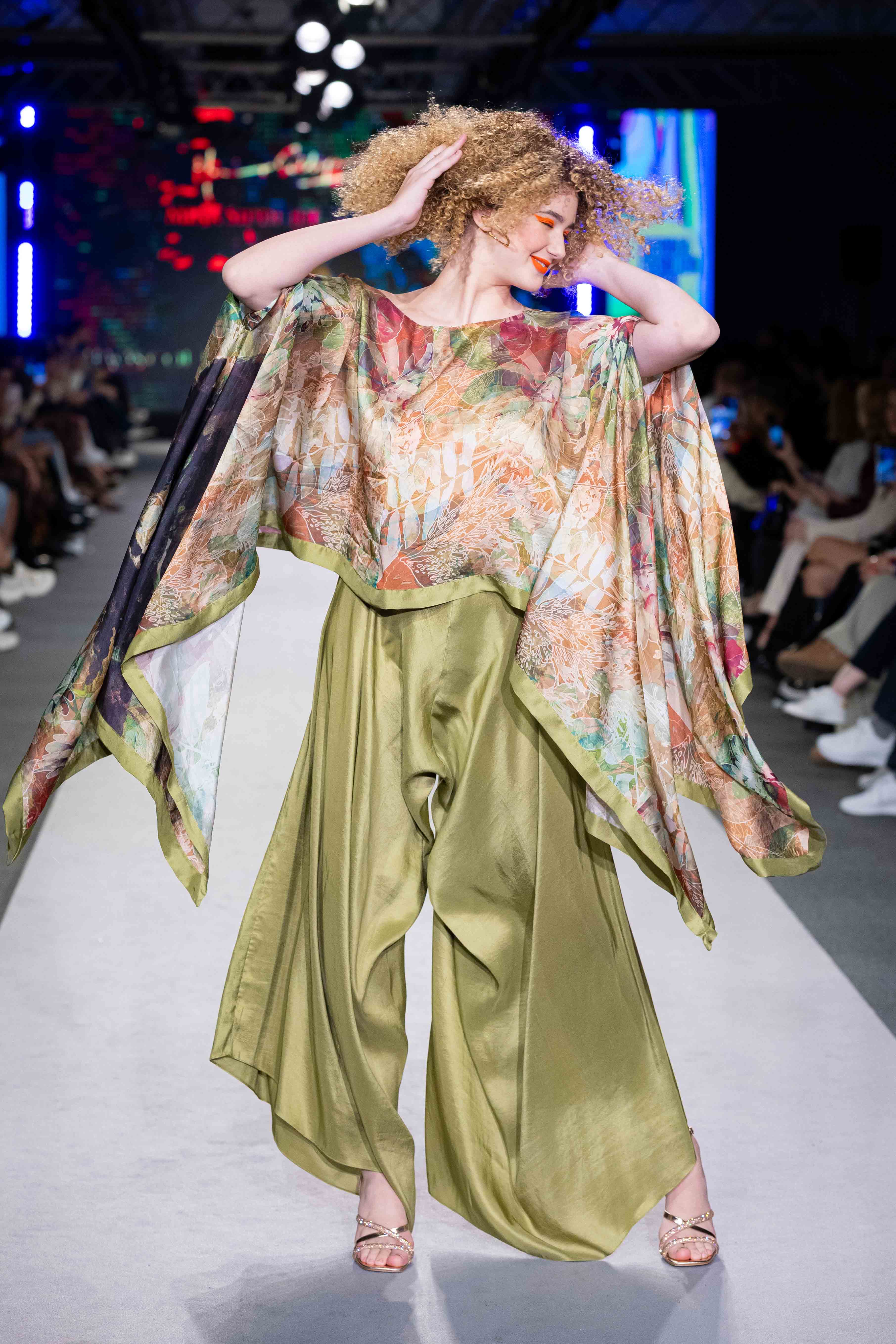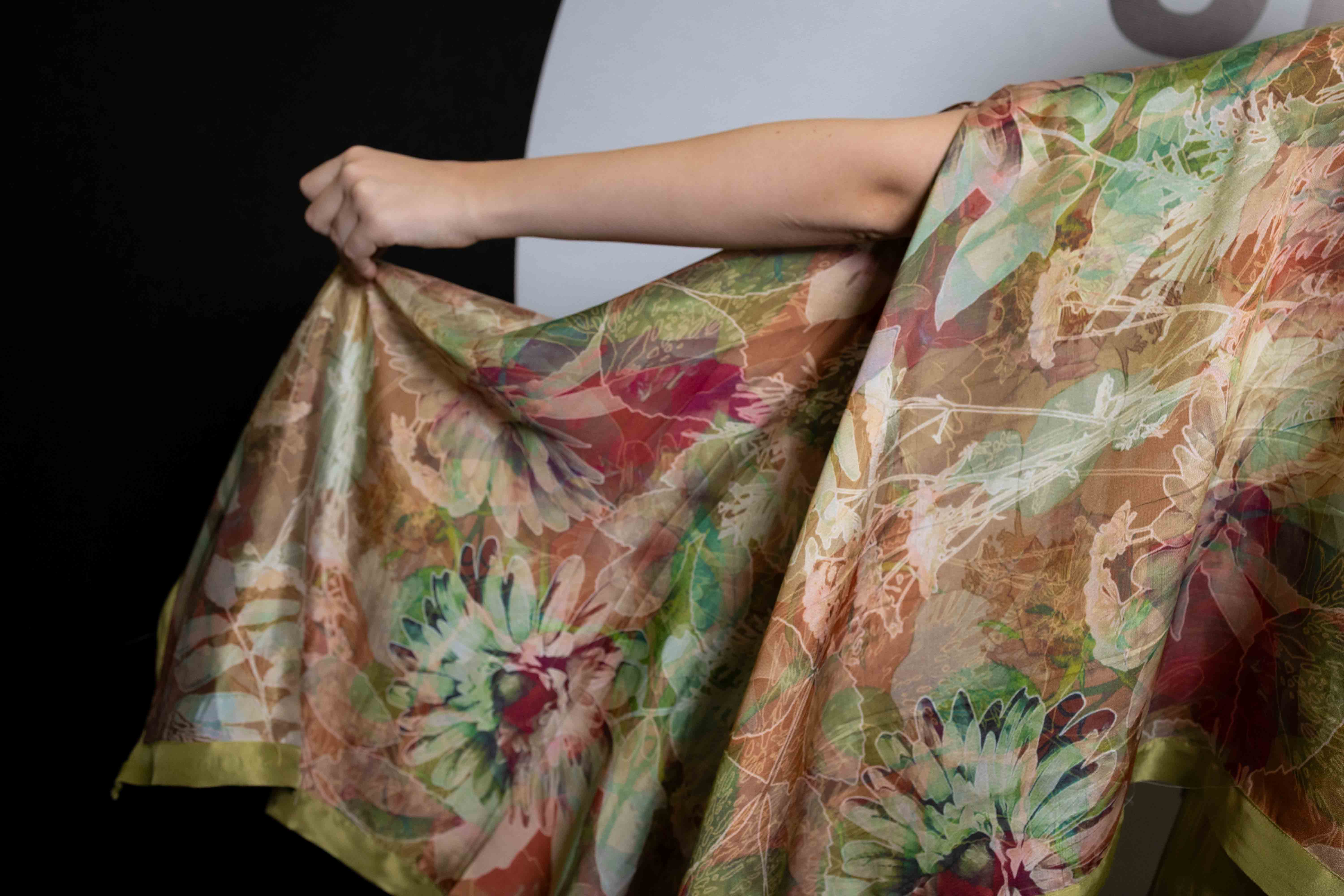 Verdant is a flowing ensemble inspired by nature’s quiet strength and organic beauty. The hand-illustrated cape top blooms with earthy tones and abstract foliage, draping effortlessly over fluid silk trousers in deep olive green. The silhouette is both structured and free, balancing refinement with ease—an ode to natural grace and the timeless power of simplicity.