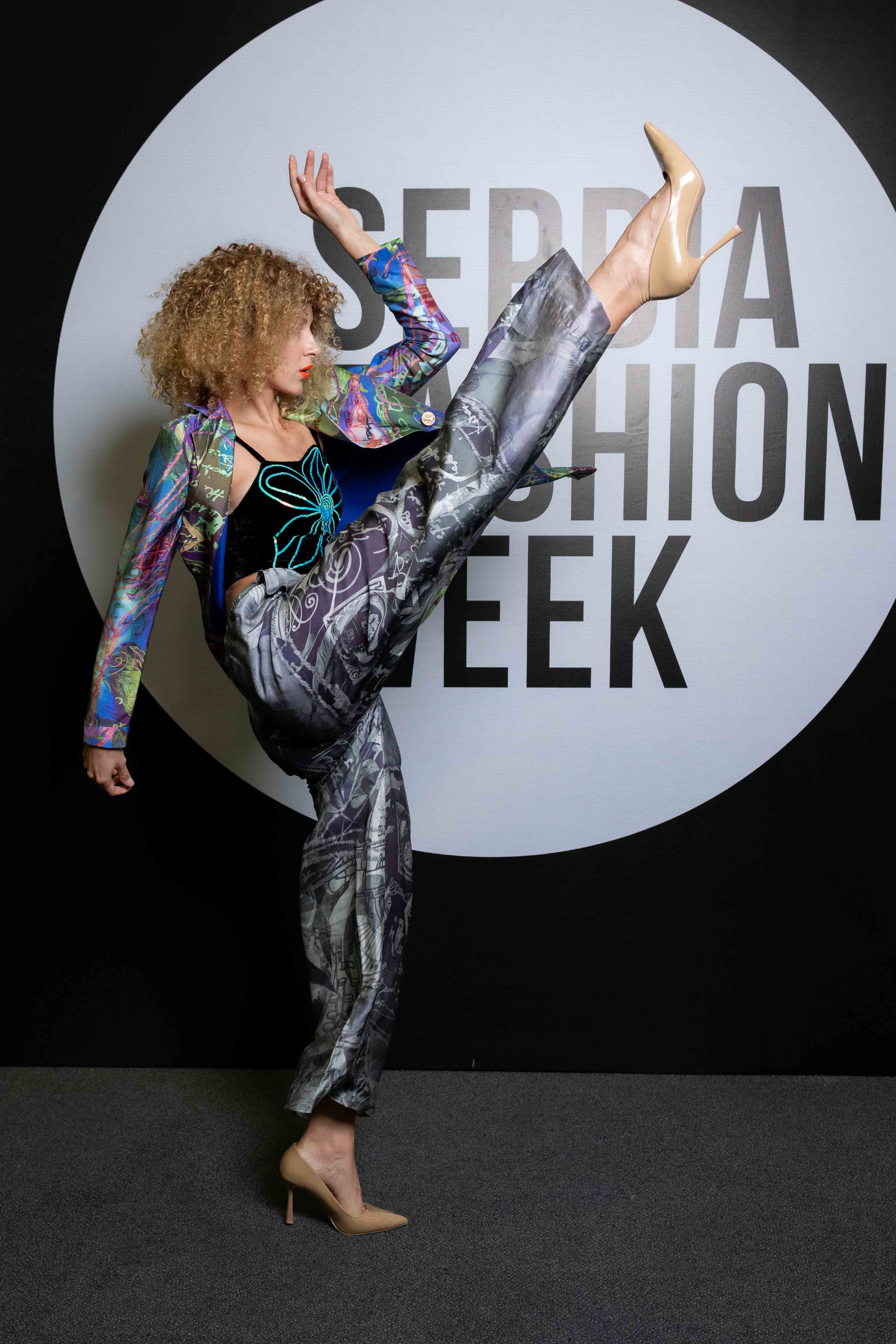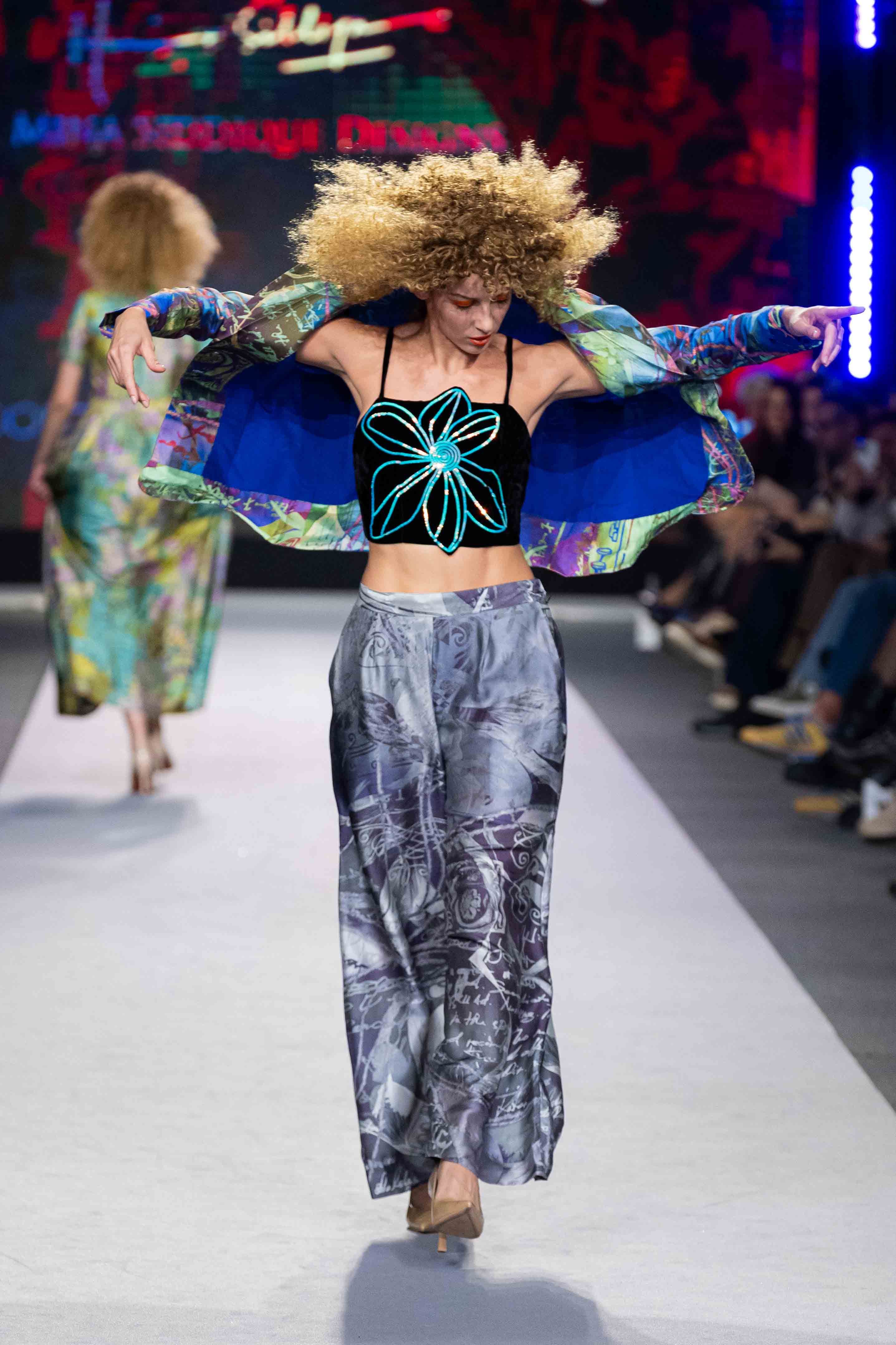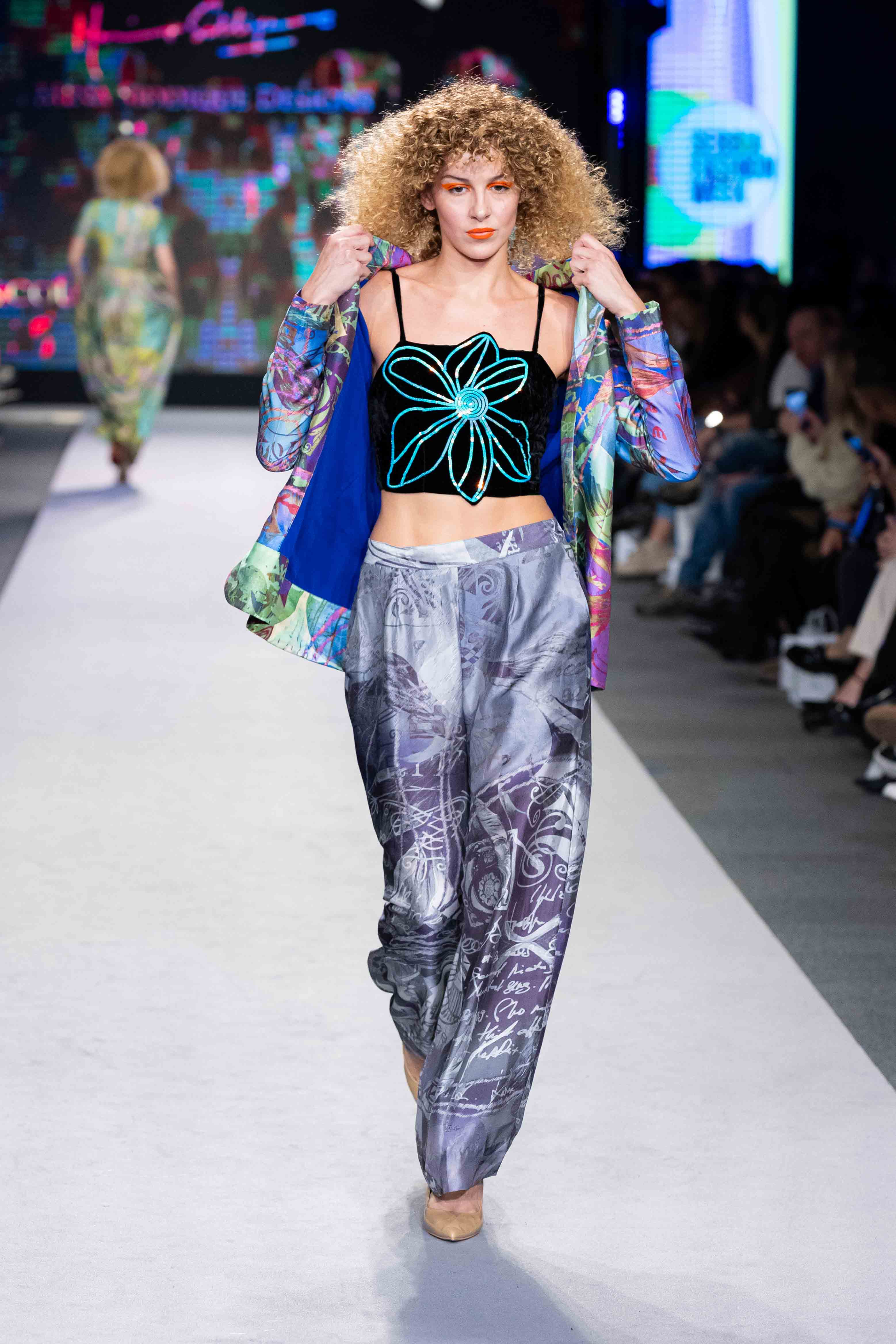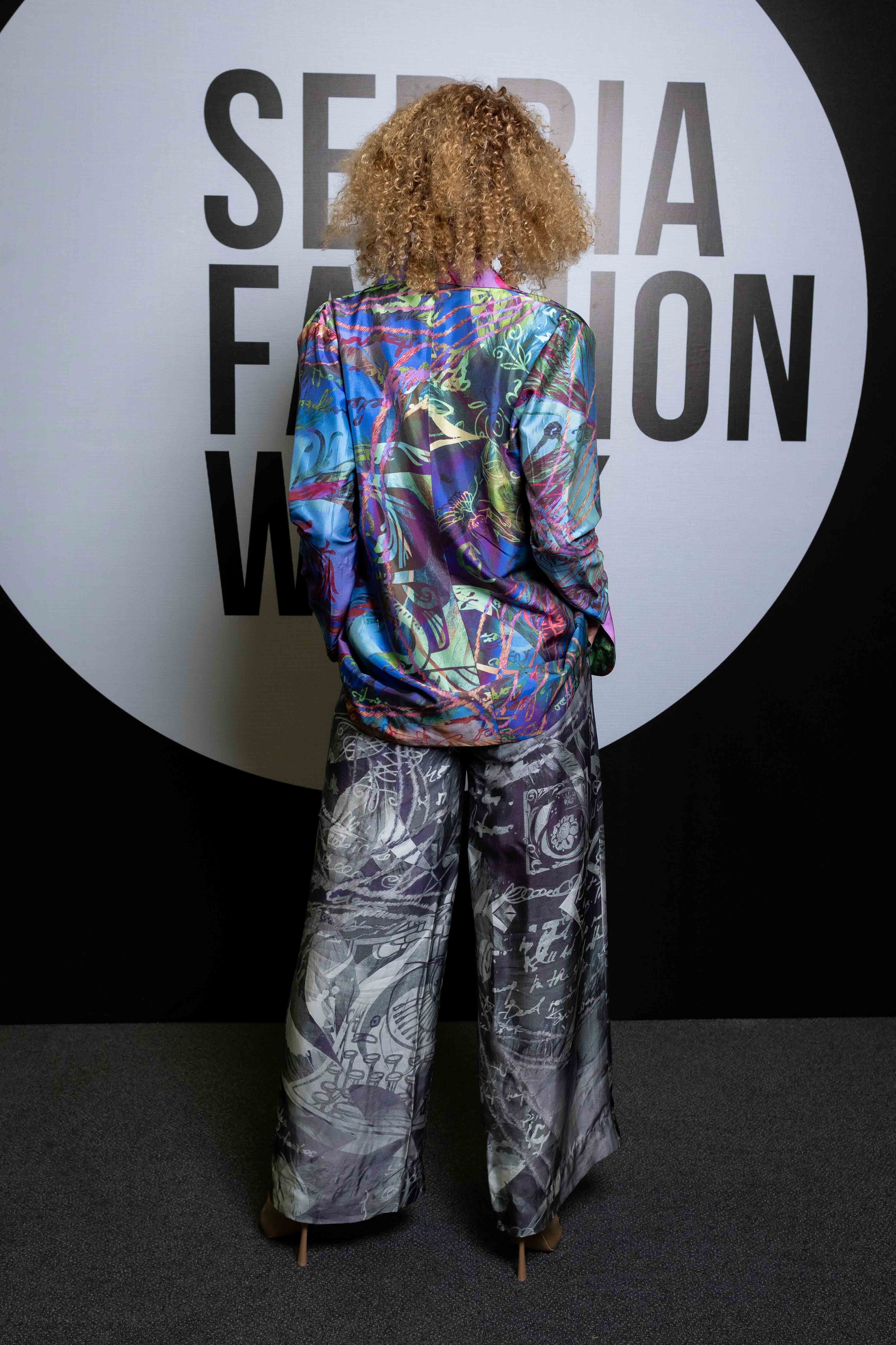 A bold mix of abstract-print trousers, a vibrant tailored jacket, and a luminous embroidered crop top, Nova radiates energy and contrast—strength, freedom, and modern edge.